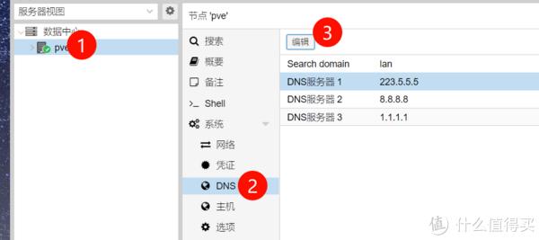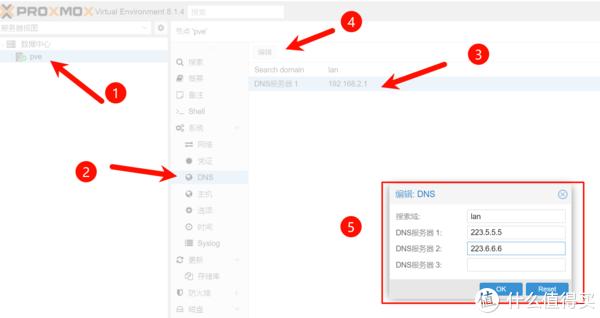 4、首先我们需要配置一下pve的dns来保证pve可以正确访问到网络,这里我使用了阿里云公共的DNS,223.5.5.5,223.6.6.6,然后点击ok。