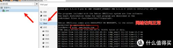 5、使用pve自带的shell工具来ping百度,测试网络是否正常,出现正确的ping值表示外网访问通畅。