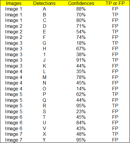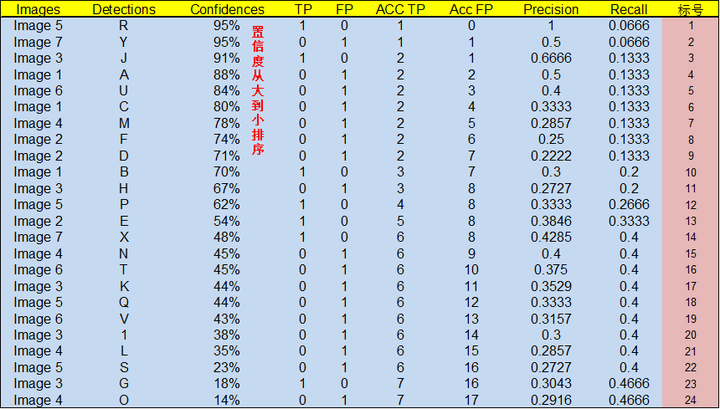 根据上图以及说明,我们可以列出以下表格,其中 Images 代表图片的编号,Detections 代表预测边框的编号,Confidences 代表预测边框的置信度,TP or FP 代表预测的边框是标记为 TP 还是 FP(认为预测边框与 GT 的 IOU 值大于等于 0.3 就标记为 TP;若一个 GT 有多个预测边框,则认为 IOU 最大且大于等于 0.3 的预测框标记为 TP,其他的标记为 FP,即一个 GT 只能有一个预测框标记为 TP),这里的 0.3 是随机取的一个值(threshold)。