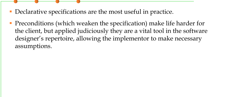 - 太弱的spec,client不放心、不敢用 (因为没有给出足够的承诺)。开发者应尽可能考虑各种特殊情况,在post-condition给出处理措施。