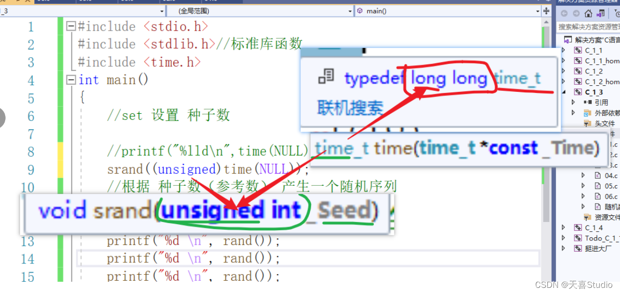 由于同一种子数为一个随机序列,这种随机数为伪随机,因此引入time()函数改变种子数即可使用srand()生成不同随机数(time毫秒单位 每毫秒变化)