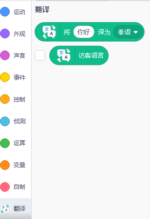 Scratch中的【翻译】模块是另一扩展模块,仍需手动添加,添加后如下: