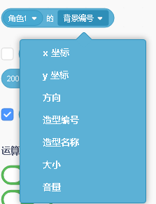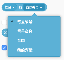 舞台的背景编号:侦测当前舞台的背景图编号。下拉三角还有多个参数如下: