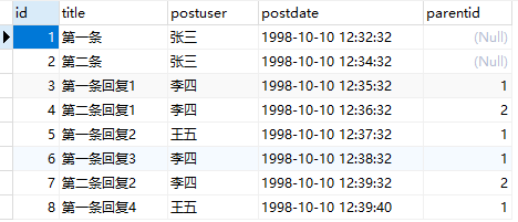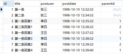 8.显示文章标题,发帖人、最后回复时间(这个题有问题,是要求显示一个人的还是显示所有人的最后回复时间?而且parentid是什么一直没搞懂)