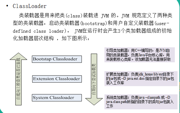 // ClassLoader类装载器 @Test public void testClassLoader1() throws ClassNotFoundException, IOException { //1、获取一个系统的类加载器 ClassLoader classLoader = ClassLoader.getSystemClassLoader(); System.out.println("系统的类加载器-->" + classLoader); //2、获取系统类加载器的父类加载器(扩展类加载器(extensions classLoader)) classLoader = classLoader.getParent(); System.out.println("扩展类加载器-->" + classLoader); //3、获取扩展类加载器的父类加载器 //输出为Null,无法被Java程序直接引用 classLoader = classLoader.getParent(); System.out.println("启动类加载器-->" + classLoader); //4、测试当前类由哪个类加载器进行加载 ,结果就是系统的类加载器 classLoader = Class.forName("com.java.reflection.Person").getClassLoader(); System.out.println("当前类由哪个类加载器进行加载-->"+classLoader); //5、测试JDK提供的Object类由哪个类加载器负责加载的 classLoader = Class.forName("java.lang.Object").getClassLoader(); System.out.println("JDK提供的Object类由哪个类加载器加载-->" + classLoader); }
