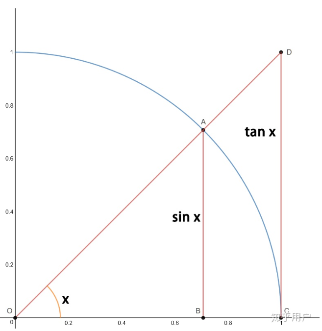 设\(x\)为该角的弧度值,则由$S_{▲OAB}<S_{扇形OAB}< S_{▲OBC} \(可知,\)sinx<x<tanx$,故有\(1<\frac{x}{sinx}<\frac{1}{cosx}\), 取倒数\(cosx<\frac{sinx}{x}<1\),由夹逼准则知,结论成立。