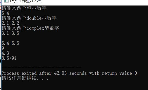 #include<iostream> using namespace std; struct Complex{ double real; double imaginary; }; int add(int a,int b); double add(double c,double d); Complex add(Complex e,Complex f); int main(){ int a,b; cout<<"请输入两个整型数字"<<endl; cin>>a>>b; double c,d; cout<<"请输入两个double型数字"<<endl; cin>>c>>d; Complex e,f; cout<<"请输入两个complex型数字"<<endl; cin>>e.real>>e.imaginary>>f.real>>f.imaginary; add(a,b); add(c,d); add(e,f); return 0; } int add(int a,int b) { cout<<a+b<<endl; } double add(double c,double d) { cout<<c+d<<endl; } Complex add(Complex e,Complex f) { cout<<e.real+f.real<<"+"<<e.imaginary+f.imaginary<<"i"<<endl; }