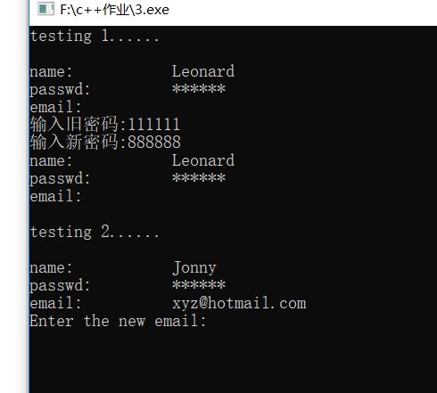 #include<iostream> #include<string> using namespace std; class User { public: void setInfo(string name0,string passwd0 = "111111", string email0 = " "); void changePasswd(); void printInfo(); void changemail(); private: string name; string passwd; string email; }; void User::setInfo(string name0, string passwd0, string email0) { name = name0; passwd = passwd0; email = email0; } void User::changePasswd() { string passwd1, passwdN; int n=1; cout << "输入旧密码:"; cin >> passwd1; while (n <= 3) { if (User::passwd == passwd1) { cout << "输入新密码:"; cin >> passwdN; break; } else if(n<3&&(User::passwd != passwd1)) { cout << "输入错误,请再试一遍:"; cin >> passwd1; n++; } else if (n == 3 && (User::passwd != passwd1)) { cout << "请稍后再试." << endl; break; } } } void User::printInfo() { cout << "name:\t\t" << name << endl; cout << "passwd:\t\t" <<"******"<< endl; cout << "email:\t\t" << email << endl; } void User::changemail() { string emailN; char a = '@'; string::size_type idx; cout << "Enter the new email:"; cin >> emailN; idx = emailN.find(a); while (idx == string::npos) { cout << "Add @ to your email:"; cin >> emailN; idx = emailN.find(a); } } int main() { cout << "testing 1......" << endl << endl; User user1; user1.setInfo("Leonard"); user1.printInfo(); user1.changePasswd(); user1.printInfo(); cout << endl << "testing 2......" << endl << endl; User user2; user2.setInfo("Jonny", "92197", "xyz@hotmail.com"); user2.printInfo(); user2.changemail(); system("pause"); return 0; }