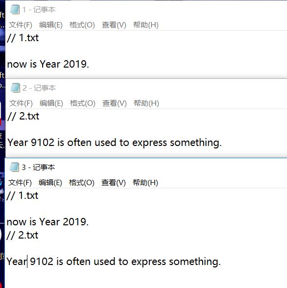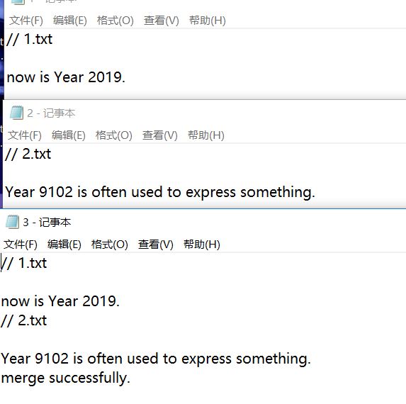 // 合并两个文件内容到一个新文件中。 // 文件名均从键盘输入 #include <iostream> #include <fstream> #include <string> #include <cstdlib> using namespace std; int main() { string filename1, filename2, newfilename; cout << "输入要合并的两个文件名: "; cin >> filename1 >> filename2; cout << "输入合并后新文件名: "; cin >> newfilename; ofstream fout; // 输出文件流对象 ifstream fin; // 输入文件流对象 fin.open(filename1); // 将输入文件流对象fin与文件filename1建立关联 if (!fin.is_open()) { // 如果打开文件失败,则输出错误提示信息并退出 cerr << "fail to open file " << filename1 << endl; system("pause"); exit(0); } fout.open(newfilename); // 将输出文件流对象fout与文件newfilename建立关联 if (!fin.is_open()) { // 如果创建/打开文件失败,输出错误提示信息并退出 cerr << "fail to open file " << newfilename << endl; system("pause"); exit(0); } char ch; // 从文件输入流对象fin中获取字符,并将其插入到文件输出流对象fout中 while (fin.get(ch)) fout << ch; fin.close(); // 关闭文件输入流对象fin与文件filename1的关联 fout << endl; // 向文件输出流对象fout中插入换行 fin.open(filename2); // 将输入文件流对象fin与文件filename2建立关联 if (!fin.is_open()) { // 如果打开文件失败,则输出错误提示信息并退出 cerr << "fail to open file " << filename2 << endl; system("pause"); exit(0); } // 从文件输入流对象fin中获取字符,并将其插入到文件输出流对象fout中 while (fin.get(ch)) fout << ch; fin.close(); // 关闭文件输入流对象fin与文件filename2的关联 fout.close(); // 关闭文件输出流对象fout与文件newfilename的关联 ofstream fapp; fapp.open(newfilename,ios::app); fapp<<endl<<"merge successfully."; fapp.close(); system("pause"); return 0; }