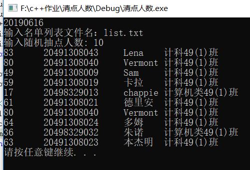 #include <iostream> #include <string> #include <fstream> #include <cstdlib> #include <time.h> #include "utils.h" using namespace std; int main() { string filename, listfilename, name; filename = getCurrentDate(); cout << filename << endl; int n, num[100], m, i = 1, j; cout << "输入名单列表文件名:"; cin >> listfilename; cout << "输入随机抽点人数: "; cin >> n; ifstream fin; ofstream fout; fin.open(listfilename); if (!fin.is_open()) { cerr << "fail to open " << listfilename << endl; system("pause"); exit(0); } fout.open(filename, ios_base::app); if (!fout.is_open()) { cerr << "fail to open " << filename << endl; system("pause"); exit(0); } srand(time(0)); while (n--) { m = 1 + rand() % 83; num[i] =m; i++; fin.clear(); fin.seekg(0); for (j = 1; j <= m; j++) getline(fin, name); fout << name << endl; cout << name; cout<< endl; } fout << endl; fin.close(); fout.close(); system("pause"); return 0; }