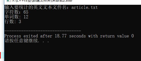 #include<iostream> #include<cstdlib> #include<string> #include<fstream> using namespace std; int main(){ string filename; cout << "输入要统计的英文文本文件名:"; cin>>filename; ifstream fin; fin.open(filename); if(!fin.is_open()){ cerr << "fail to open " << filename << endl; system("pause"); exit(0); } int ch=0,word=0,line=0; char ch1; int flag=1; while(fin.get(ch1)){ if(ch1==' '){ ch++; if(flag==0) flag=1; } else if(ch1=='\n'){ line++; if(flag==0) flag=1; } else if(flag&&((ch1>='a'&&ch1<='z')||(ch1>='A'&&ch1<='Z'))){ flag=0; ch++; word++; } else ch++; } if(ch1!='\n') line++; cout << "字符数:" << ch << endl; cout << "单词数: " << word << endl; cout << "行数: " << line << endl; fin.close(); return 0; }