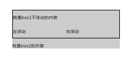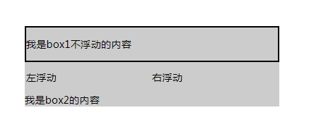 <div class="container"><div class="box1"><p>我是box1不浮动的内容 </p><div class="left">左浮动</div><div class="right">右浮动</div></div><div class="box2"><p>我是box2的内容 </p></div></div>