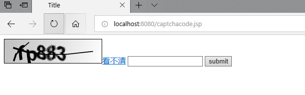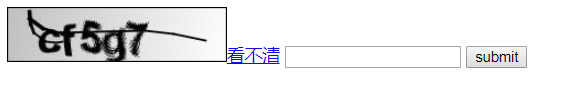 <script type="text/javascript">function reloadCode() {var date = new Date().getTime();document.getElementById("code").src = "<%=request.getContextPath() %>/imageKaptcha?d="+date;}</script><form action="checkCaptcha.jsp" method = "post"><img alt="验证码" src="imageKaptcha" id = "code"><a href = "javascript:reloadCode();">看不清</a><input type = "text" name = "captcha"><input type = "submit" value = "submit"></form>