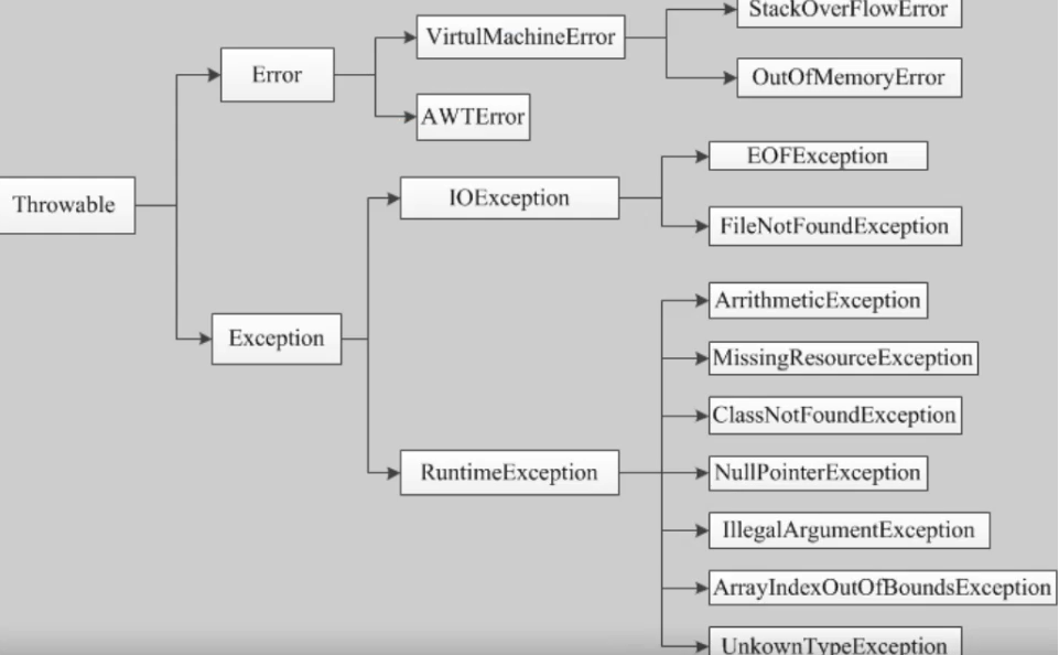 - 错误ERROR:错误不是异常,而是脱离程序员控制的问题。错误在代码中通常被忽略。例如,当栈溢出时,一个错误就发生了,它们在编译也检查不到的。