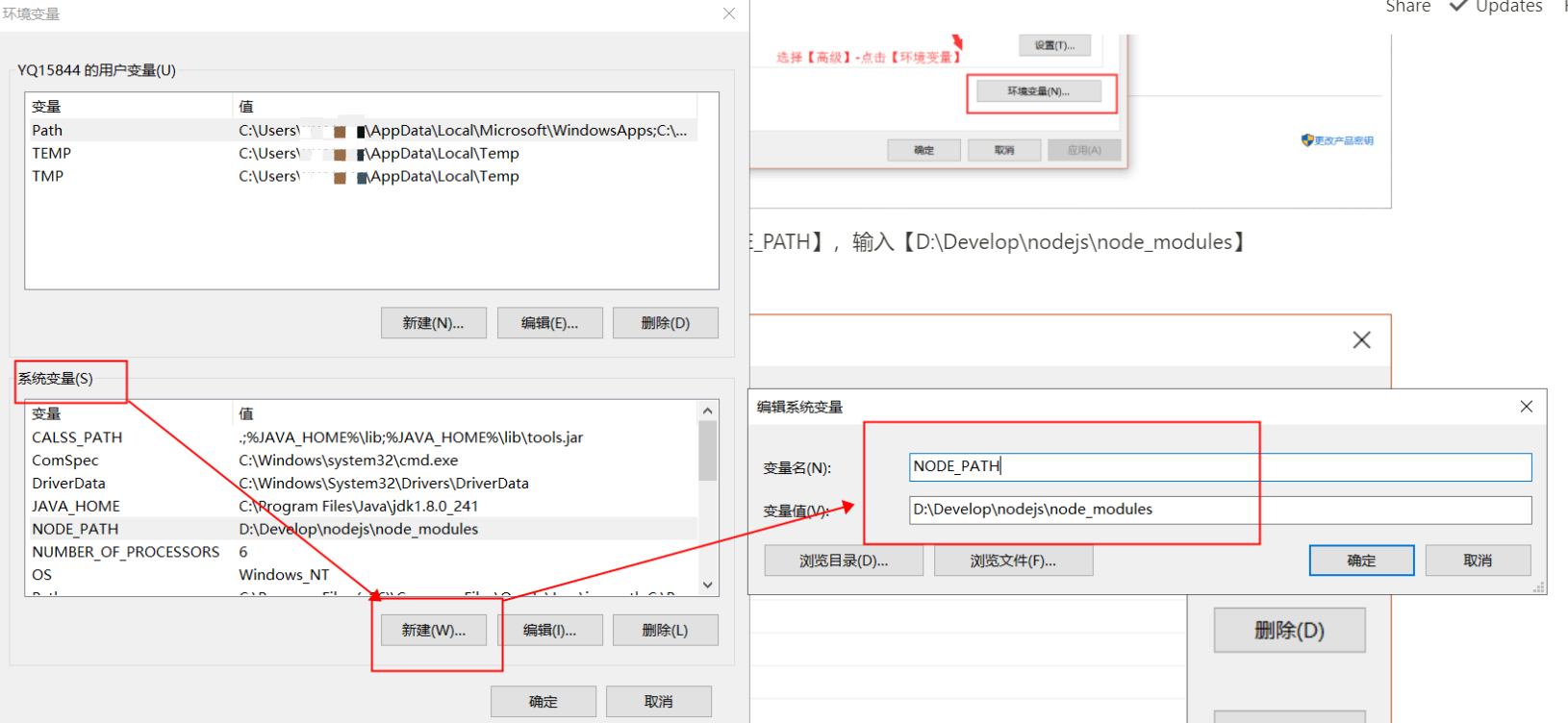 在【系统变量】下新建【NODE_PATH】,输入【D:\Develop\nodejs\node_modules】