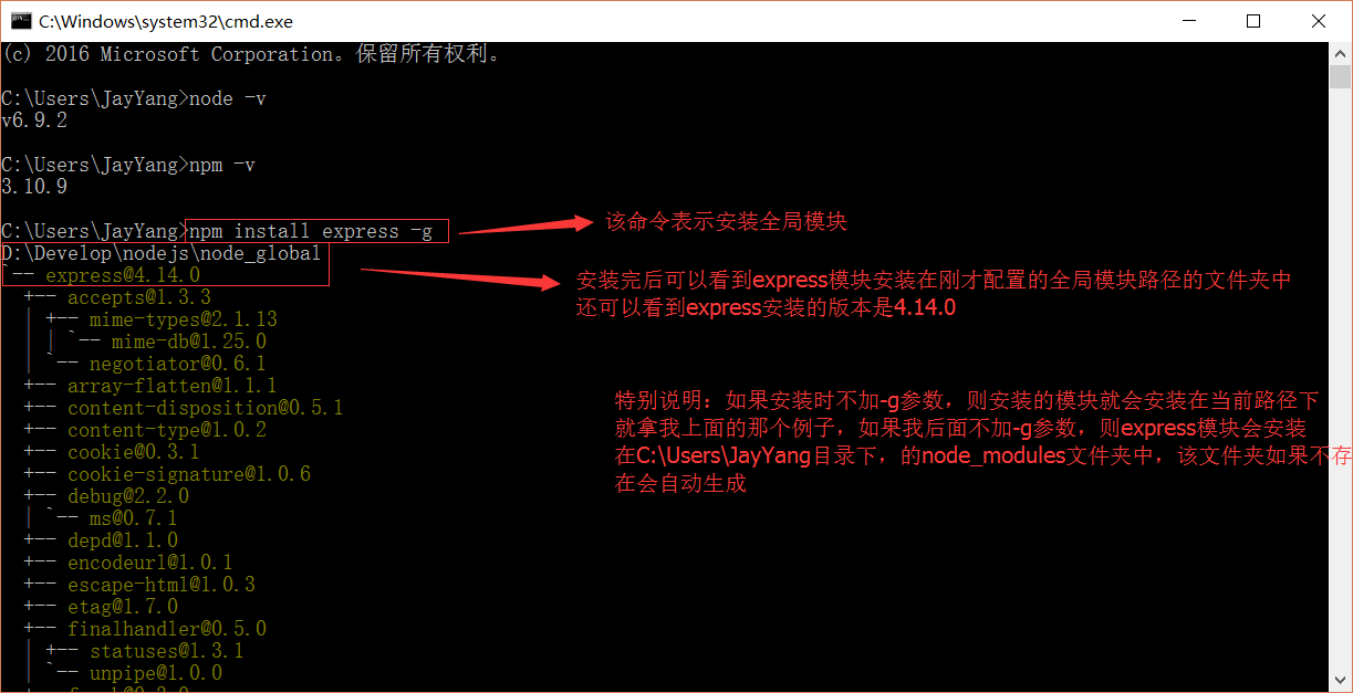 配置完后,安装个module测试下,我们就安装最常用的express模块,打开cmd窗口, 输入如下命令进行模块的全局安装: