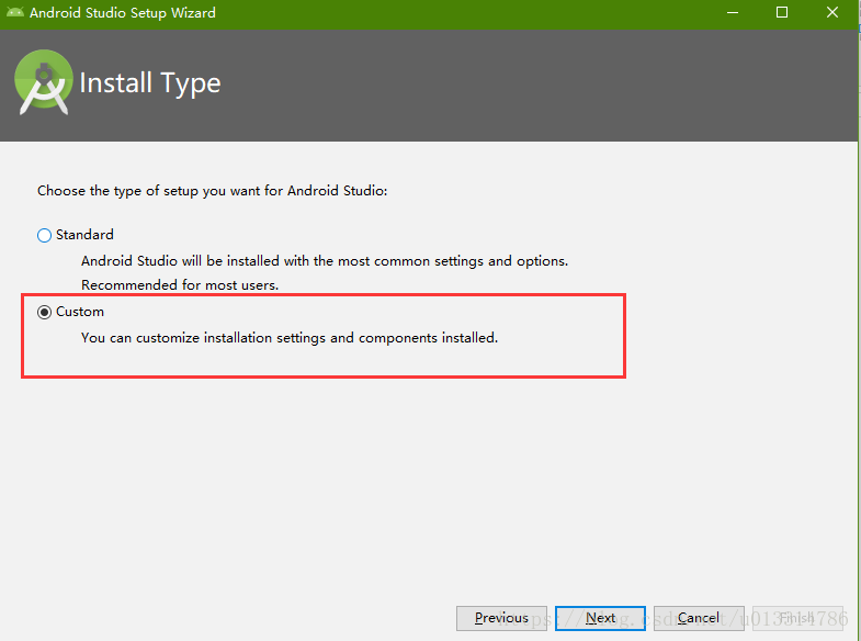 注意:接下来一路Next,到了选择SDK的页面注意一下选择Custom,这样可以只安装自己喜欢的部分,接下来选择主题,当然这个以后可以在Android Studio里边改
