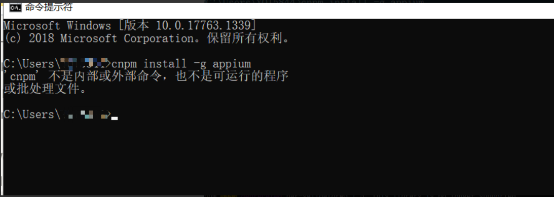 安装appium,执行:cnpm install -g appium,命令后出现:cnpm不是内部或外部命令,也不是可运行的程序,见下图: