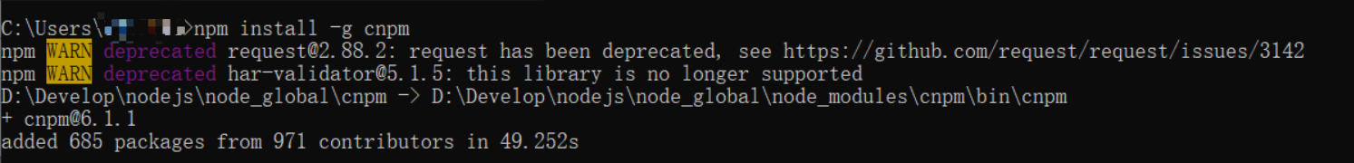 没有cnpm包,需要先安装cnpm:命令行输入:npm install -g cnpm,出现下图为安装成功