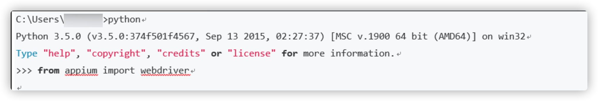 输入命令“python”—>“from appium import webdriver” 回车,如果控制台没有报错,则说明安装成功