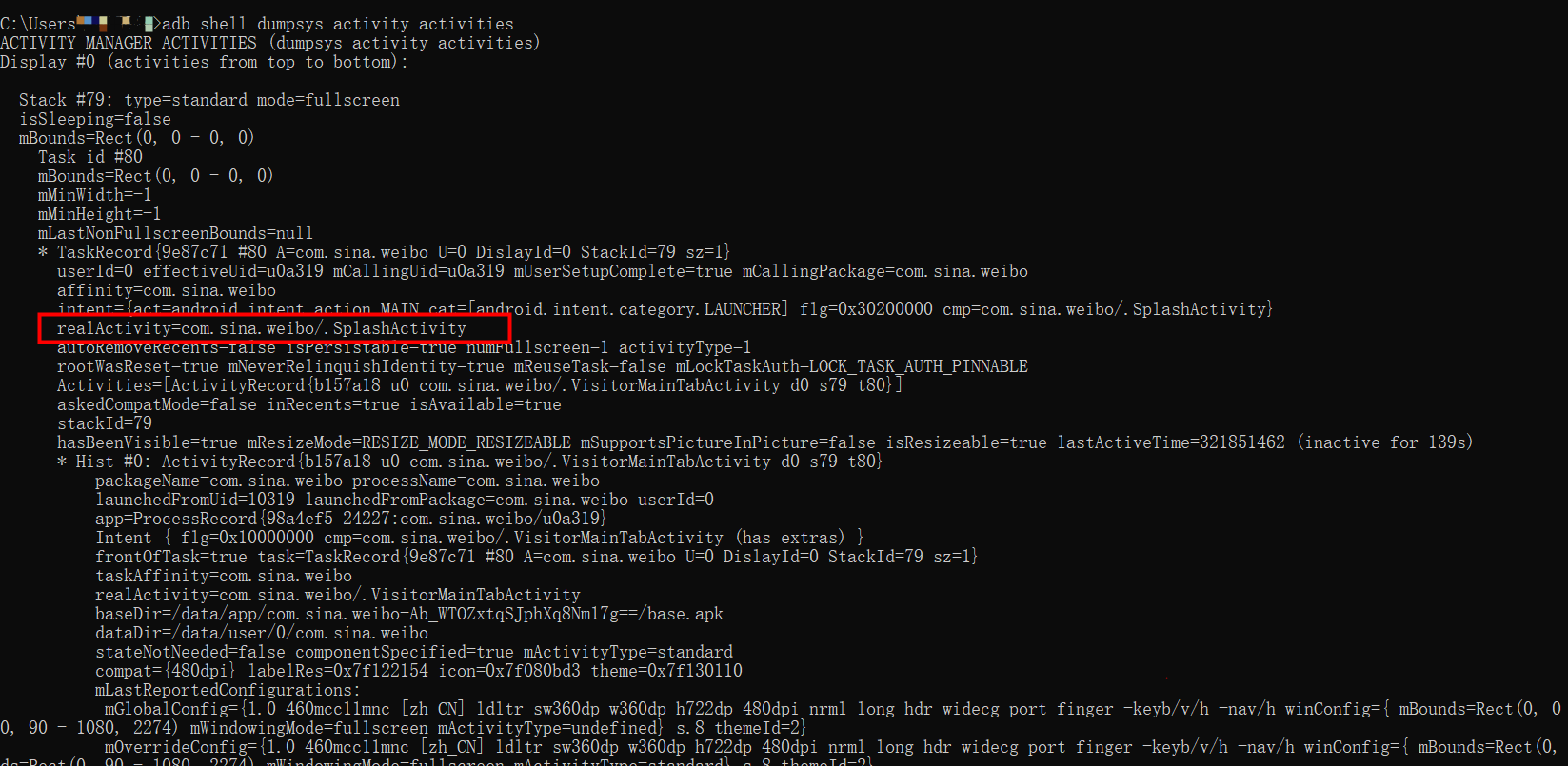 下图中红色框内的即表示当前页面的activity,下图为微博实例,所以当前页面的activity 为:com.sina.weibo/.SplashActivity