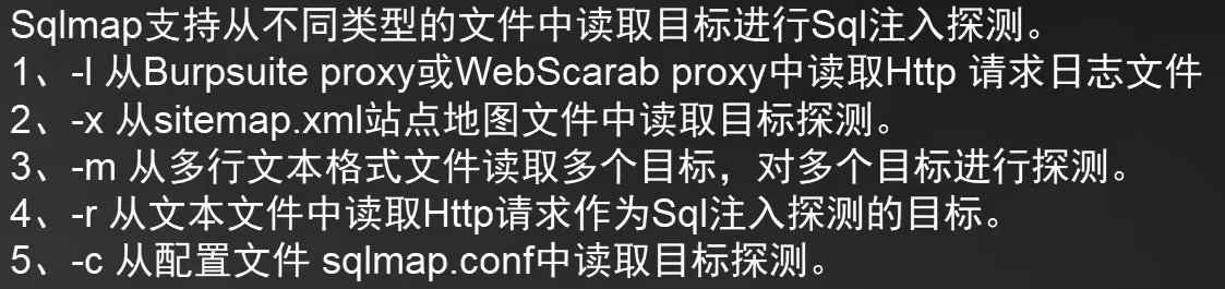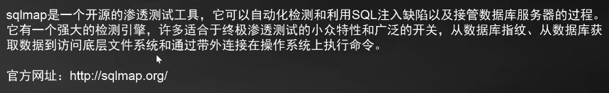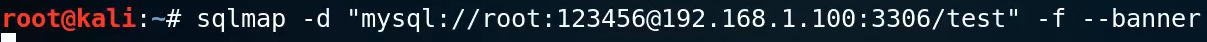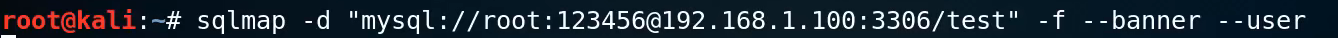 python sqlmap.py -d(直联) "mysql(数据库类型)://用户名:密码@IP地址/具体的数据库名称" -f --banner --dbs --users (服务型)