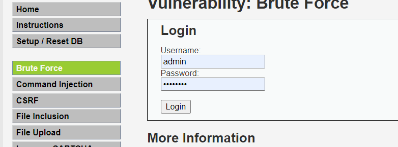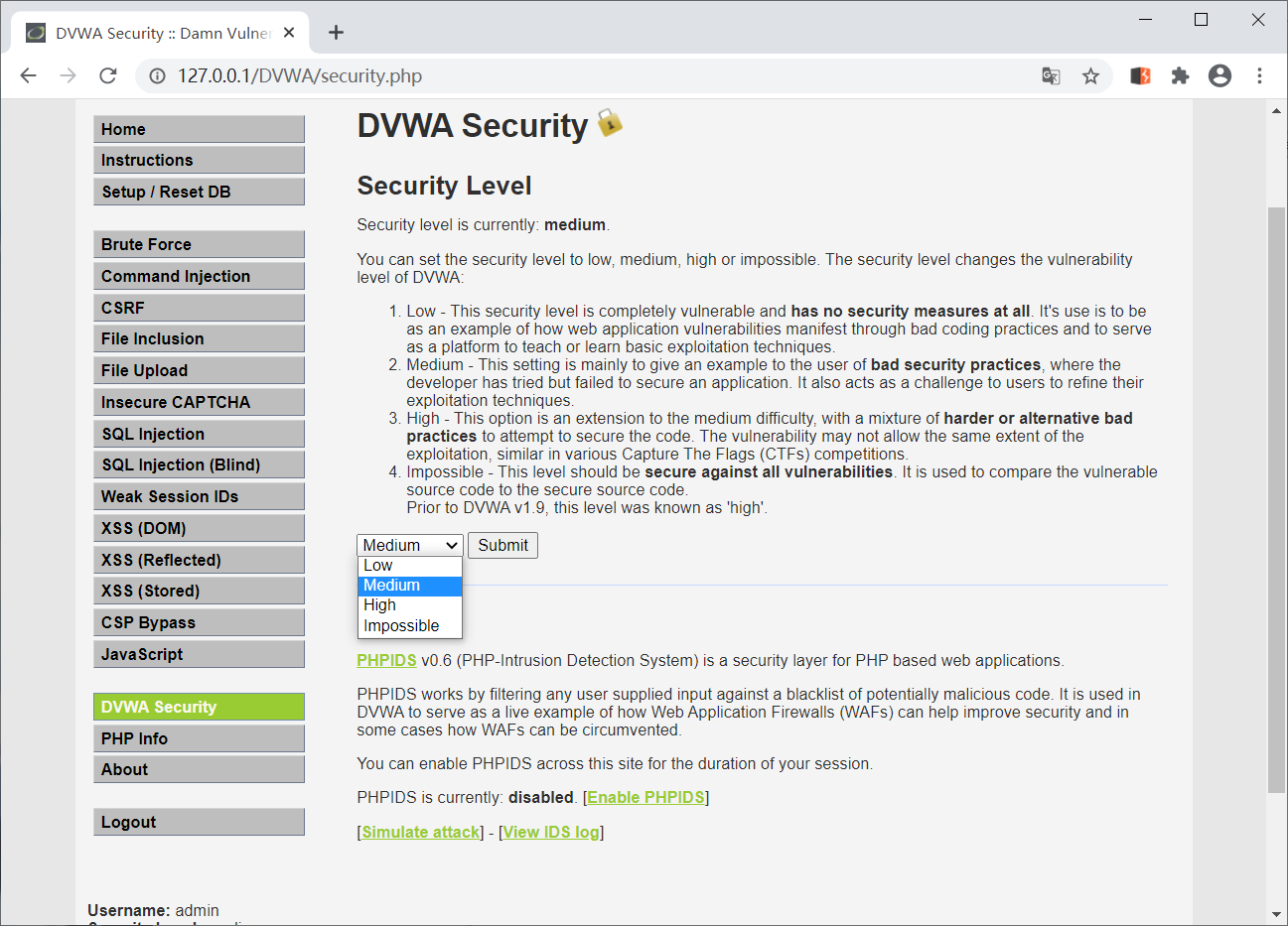 Brute Force(暴力(破解))、Command Injection(命令行注入)、CSRF(跨站请求伪造)、 File Inclusion(文件包含)、File Upload(文件上传)、Insecure CAPTCHA (不安全的验证码)、 SQL Injection(SQL注入)、SQL Injection(Blind)(SQL盲注)、XSS(DOM)(基于DOM树)、 XSS(Reflected)(反射型跨站脚本)、XSS(Stored)(存储型跨站脚本)