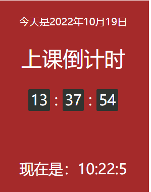 <!DOCTYPE html> <html> <head> <meta charset="UTF-8"> <title></title> <style> .countdown { width: 240px; height: 305px; text-align: center; line-height: 1; color: #fff; background-color: brown; /* background-size: 240px; */ /* float: left; */ overflow: hidden; } .countdown .next { font-size: 16px; margin: 25px 0 14px; } .countdown .title { font-size: 33px; } .countdown .tips { margin-top: 80px; font-size: 23px; } .countdown small { font-size: 17px; } .countdown .clock { width: 142px; margin: 18px auto 0; overflow: hidden; } .countdown .clock span, .countdown .clock i { display: block; text-align: center; line-height: 34px; font-size: 23px; float: left; } .countdown .clock span { width: 34px; height: 34px; border-radius: 2px; background-color: #303430; } .countdown .clock i { width: 20px; font-style: normal; } </style> </head> <body> <div class="countdown"> <p class="next">今天是2022年10月17日</p> <p class="title">上课倒计时</p> <p class="clock"> <span id="hour">00</span> <i>:</i> <span id="minutes">25</span> <i>:</i> <span id="scond">20</span> </p> <p class="tips"> 现在是10:30:00 </p> </div> <script type="text/javascript"> var next = document.querySelector('.next'); var hour = document.querySelector('#hour'); var minutes = document.querySelector('#minutes'); var scond = document.querySelector('#scond'); var tips = document.querySelector('.tips'); var date1 = new Date(); var year = date1.getFullYear() var month = date1.getMonth() + 1; var dates = date1.getDate(); dates=dates<10 ? '0'+dates : dates; //解决头部:今天是2022年10月17日 next.innerHTML=`今天是${year}年${month}月${dates}日`; time(); setInterval(time,1000); function time(){ //1、获取当前时间戳 var now=+new Date(); //获取指定的时间戳 var last=+new Date('2022-10-20 00:00:00'); //得到当前时间和指定时间的差 var count=(last-now)/1000; var h=parseInt(count / 60 / 60 % 24); h=h<10 ? '0'+h : h; var m=parseInt(count / 60 % 60); m=m<10 ? '0'+m : m; var s=parseInt(count % 60); s=s<10 ? '0'+s : s; hour.innerHTML=h; minutes.innerHTML=m; scond.innerHTML=s; } getTimes(); setInterval(getTimes, 1000); function getTimes() { var date2 = new Date(); var hours = date2.getHours(); var minutes = date2.getMinutes(); var seconds = date2.getSeconds(); tips.innerHTML = `现在是:${hours}:${minutes}:${seconds}`; } </script> </body> </html>