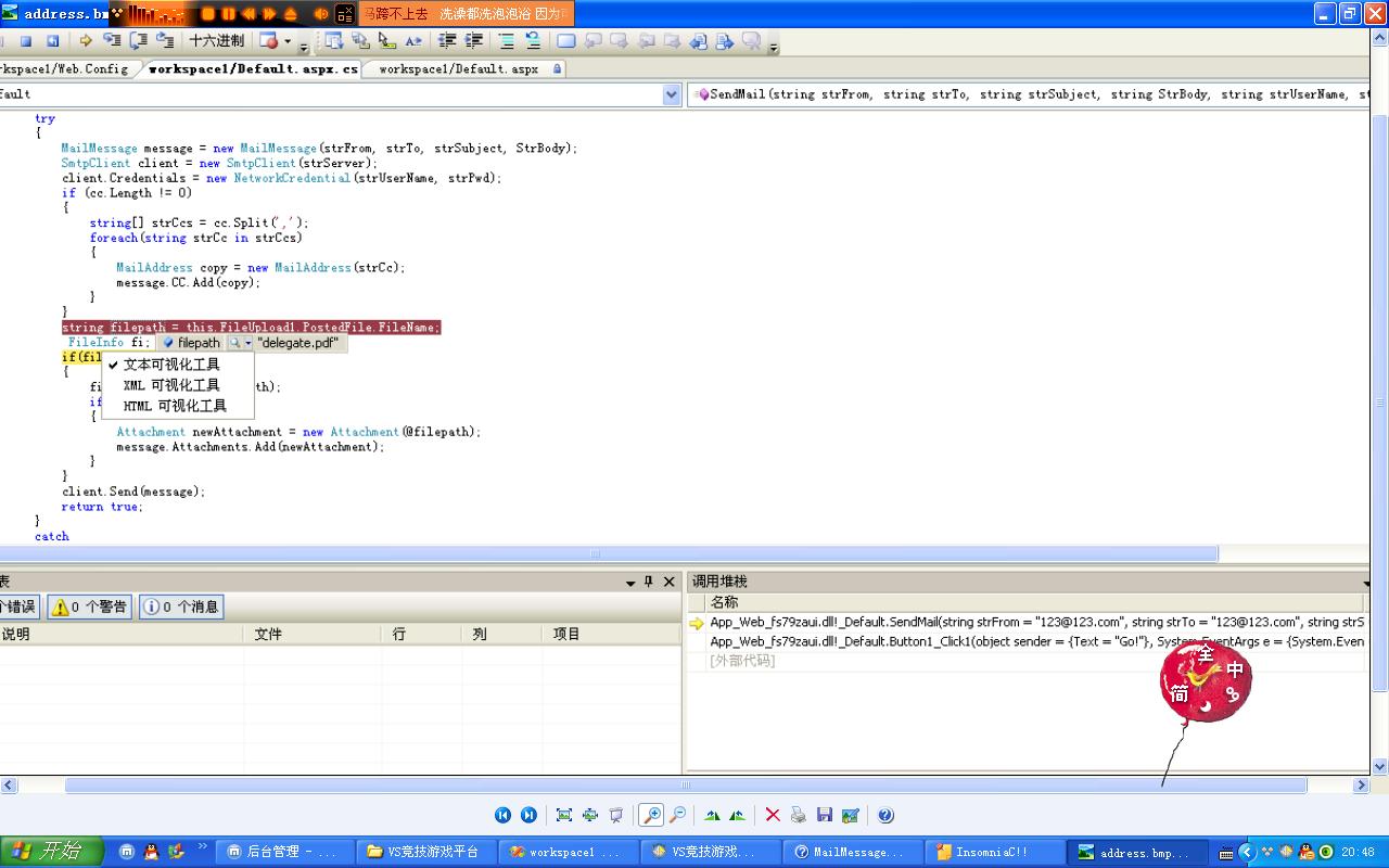但是,还有一点没搞明白的...就是如果上传附件的话,我要取文件的绝对路径,也就是像C:\Documents and Settings\tmac_\桌面\delegate.pdf这样的路径,我在公司的话用this.FileUpload1.PostedFile.FileName就能取到...但是我回家就只能取到delegate.pdf这个东西了,非常奇怪非常奇怪...有图片为证...先上家的图片,明天再传公司的图片...