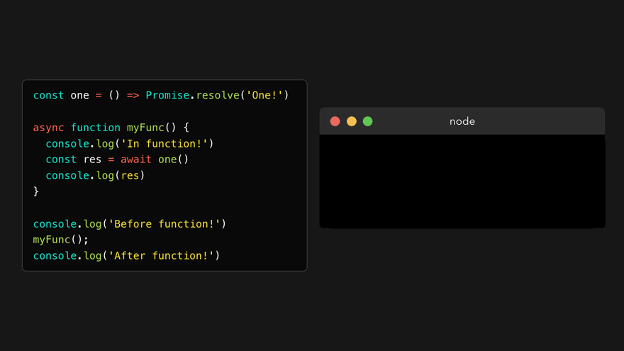 myFunc()的其他函数体继续执行,当执行到第二行时候. 终于, 我们看到await关键字!