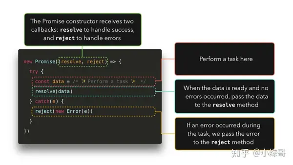 在上面示例中,我们只是简单的传递了一个回调函数给Promise的构造器,但是实际上这个回调函数接受两个参数,第一个参数我们称为resolve或者简称res,这个方法是当这个promise应该被resolve时候调用,第二个参数我们称为reject或者简称rej,这个方法是当这个promise应该被reject时候调用,意味着程序出错了。