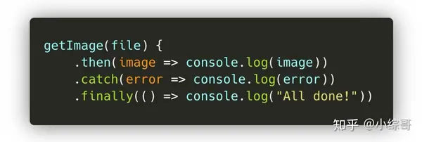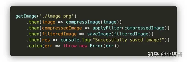 因此在getImage示例中,我们可以链式调用多个then方法,把处理过的image对象传入到下一个回调。这样我们就彻底甩脱了回调地狱,得到一个整洁的链式回调。