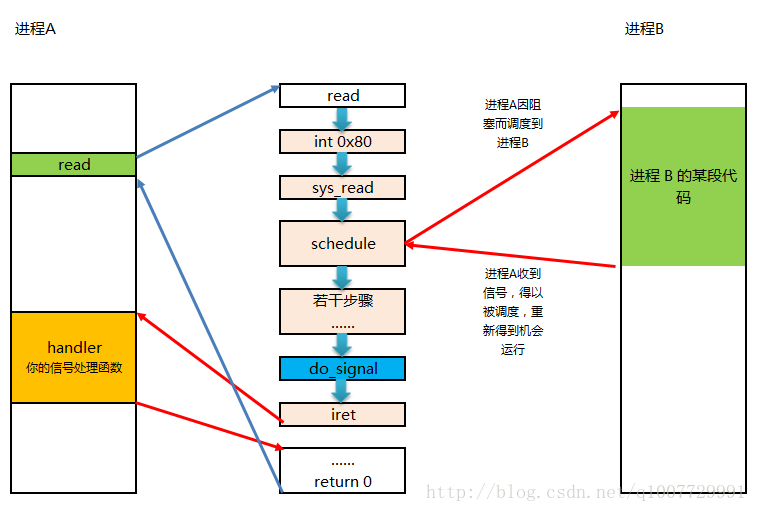 如果进程没有收到信号,do_signal 函数直接返回,执行 iret 后直接返回到 read 函数。图中没有画线条,因为这种情况比较简单。