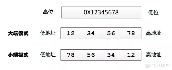大端模式(Big-Endian):数据的低位字节放到内存的高地址端,高位字节放到内存的低地址端。