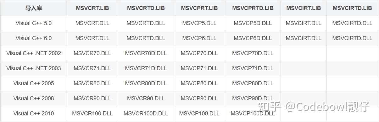 多线程的动态运行时库是|msvcrt.lib+msvcrtxx.dll,之所以是msvcrtxx.dll是因为每一个版本的VS使用的库名称还不一样。而且还不止包含一个库,除了主要的MSVCRT库外,还有MSVCPRT、MSVCIRT库。它们之间的对应关系如下: