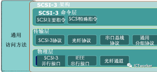 SCSI 采取分层结构。SCSI分三层,即SCSI应用层,SCSI传输协议层和SCSI互连层。
