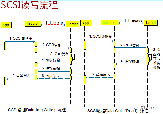 传输协议层,SCSI设备之间通过一系列的命令实现数据块的传送,大致分成三个阶段:命令的执行,数据的传送和命令的确认。