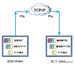 在iSCSI启动器上用户发起了一个SCSI请求,操作系统将请求处理为一条或多条SCSI指令,由CPU或者是HBA卡对指令或数据进行封装形成一个iSCSI报文,然后传送给TCP/IP层,由TCP/IP协议把iSCSI报文封装成IP包并在网络中传输。当该报文到达目的端以后TCP/IP协议将数据包进行解封装,还原成一个iSCSI封装报文,再将iSCSI包还原为SCSI指令,交由操作系统处理。