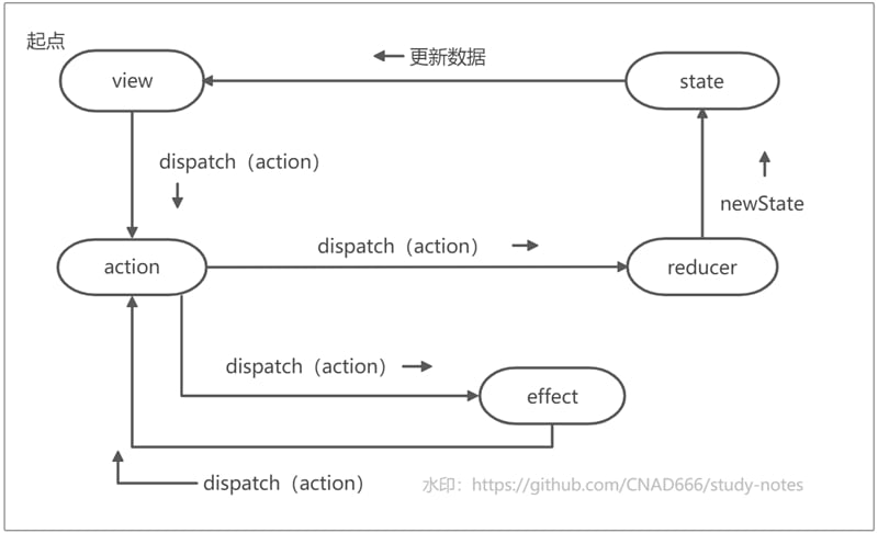 action接收到effect的意图后,帮effect建了个可以带参数的方法,并且通过Action通知了reducer,让它去把新传来的值更新一下。