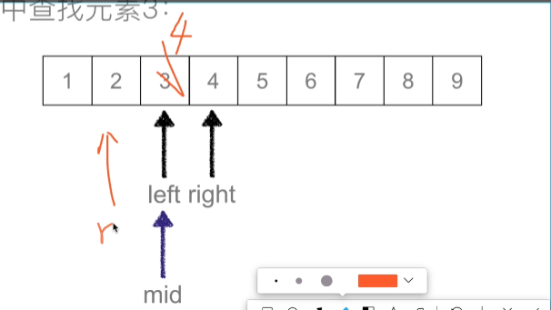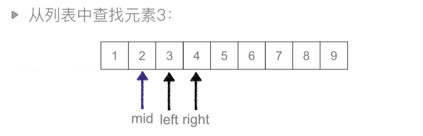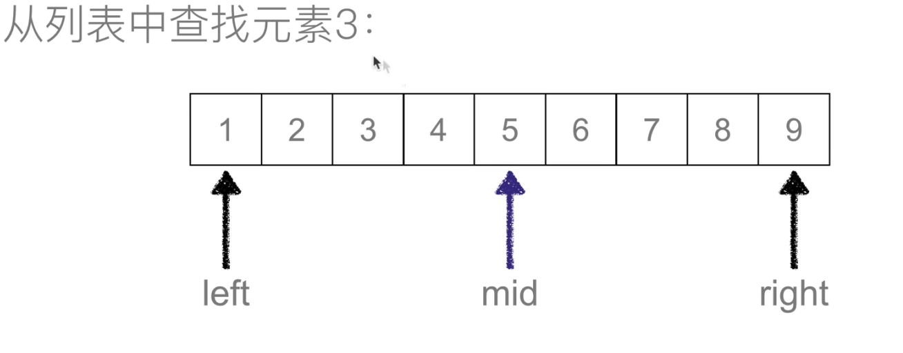 mid = (left + right)//2, 然后用mid 和 查找的元素进行比较,如果mid比查找的元素大,说明要查找的元素在左半区,此时右半区不用管了,让right移动到4这个位置(mid - 1),然后在计算新的mid = (left + right)/2,