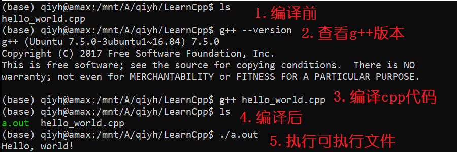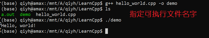 g++ xxx.cpp默认生成名为a.out的可执行文件g++ xxx.cpp -o exe_filename生成名为exe_filename的可执行文件- Windows的可执行文件一般为