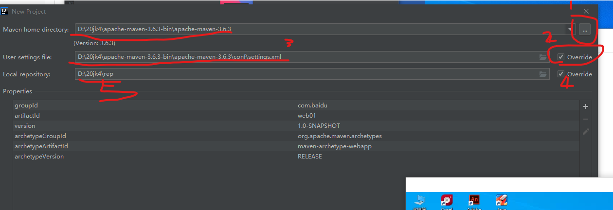 1为maven文件夹 2为勾上换setting位置3为maven文件夹中conf文件夹下的setting位置 4为配置文件位置