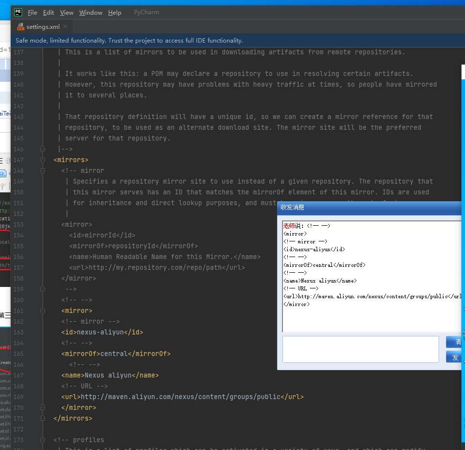 <mirror> <!-- mirror --> <id>nexus-aliyun</id> <!-- --> <mirrorOf>central</mirrorOf> <!-- --> <name>Nexus aliyun</name> <!-- URL --> <url>http://maven.aliyun.com/nexus/content/groups/public</url> </mirror>