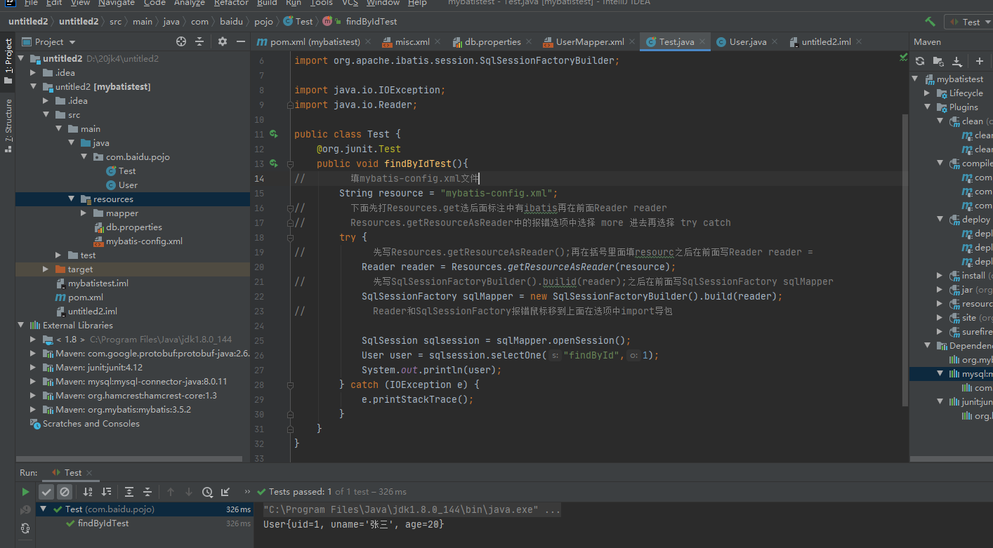 package com.baidu.pojo; import org.apache.ibatis.io.Resources; import org.apache.ibatis.session.SqlSession; import org.apache.ibatis.session.SqlSessionFactory; import org.apache.ibatis.session.SqlSessionFactoryBuilder; import java.io.IOException; import java.io.Reader; public class Test { @org.junit.Test public void findByIdTest(){ // 填mybatis-config.xml文件 String resource = "mybatis-config.xml"; // 下面先打Resources.get选后面标注中有ibatis再在前面Reader reader // Resources.getResourceAsReader中的报错选项中选择 more 进去再选择 try catch try { // 先写Resources.getResourceAsReader();再在括号里面填resourc之后在前面写Reader reader = Reader reader = Resources.getResourceAsReader(resource); // 先写SqlSessionFactoryBuilder().builid(reader);之后在前面写SqlSessionFactory sqlMapper SqlSessionFactory sqlMapper = new SqlSessionFactoryBuilder().build(reader); // Reader和SqlSessionFactory报错鼠标移到上面在选项中import导包 SqlSession sqlsession = sqlMapper.openSession(); User user = sqlsession.selectOne("findById",1); System.out.println(user); } catch (IOException e) { e.printStackTrace(); } } }
