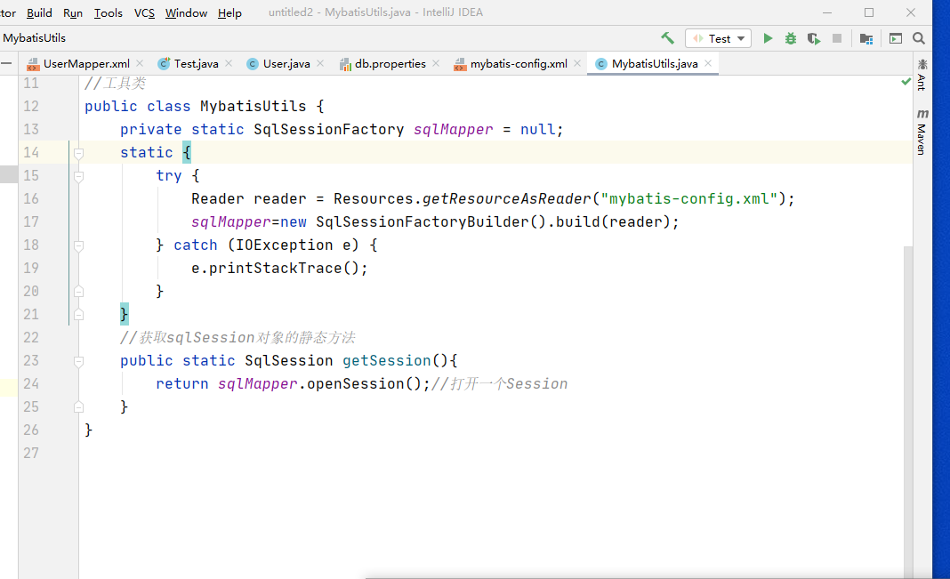 右键util包新建一个类MybatisUtils