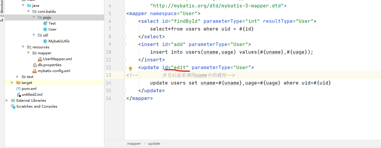 <update id="edit" parameterType="User"> <!-- 井号后面是调用uame中的属性--> update users set uname=#{uname},uage=#{uage} where uid=#{uid} </update>