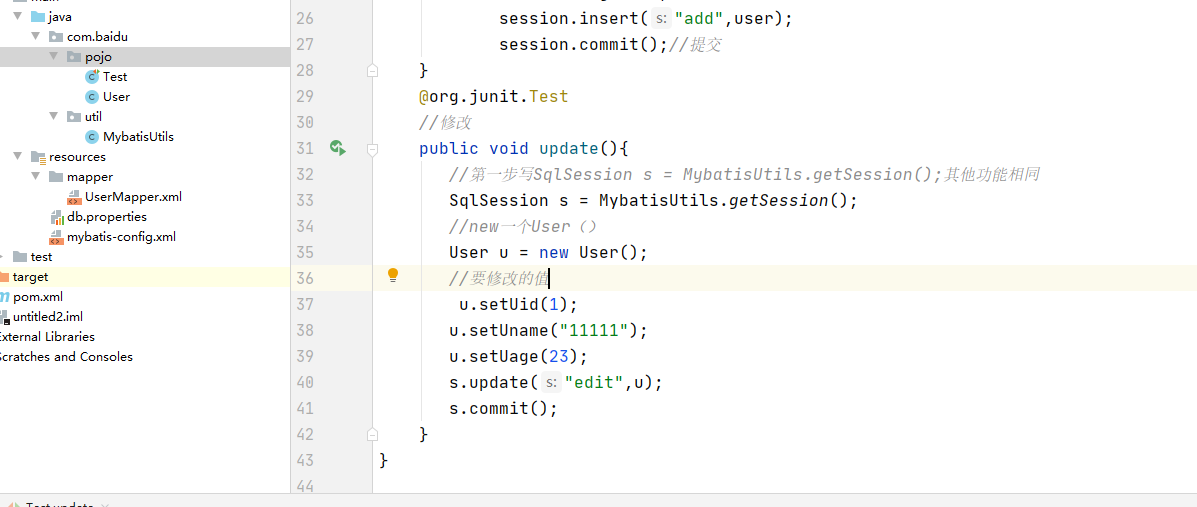 @org.junit.Test //修改 public void update(){ SqlSession s = MybatisUtils.getSession(); User u = new User(); //要修改的值 u.setUid(1); u.setUname("11111"); u.setUage(23); s.update("edit",u); s.commit(); } }