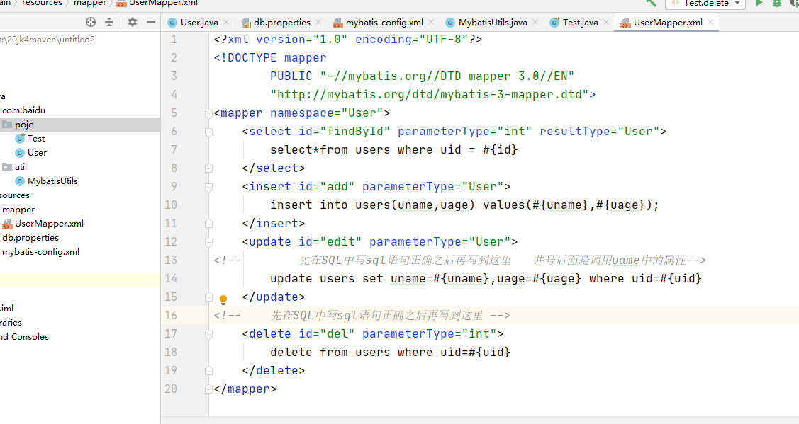 <!-- 先在SQL中写sql语句正确之后再写到这里 --> <delete id="del" parameterType="int"> delete from users where uid=#{uid} </delete>