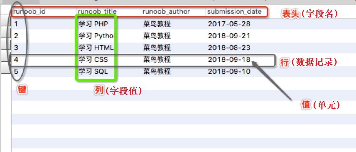 行:一行(=元组,或记录)是一组相关的数据,例如一条用户订阅的数据。